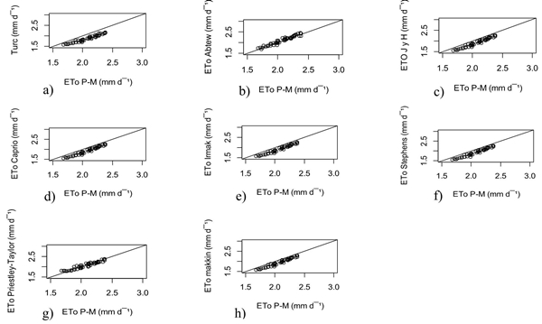 In the dispersion diagrams between the estimates of the modified models based on radiation and Penman-Monteith, it can be seen that they generally showed a trend and six of the eight models underestimated the P-M of ETo values (Figure 8). The models that performed better in the evaluation stage were: Abtew, Priestley-Tylor and Makkink (Figures 8b , 8g and 8h).