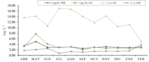 The MPL of the NOM-001 and NOM-003 for the fat and oil content is 15 mg L-1, in this work we found contents of up to 50 mg L-1, this amount of fats and oils exceeds the MPL, a high content of them in the irrigation water causes low levels of oxygenation and as a consequence the proliferation of anaerobic bacteria. In the study carried out by Bonilla (2013), two wastewater discharge sites from two industrial parks were evaluated in them, values of 56 mg L-1 were detected.