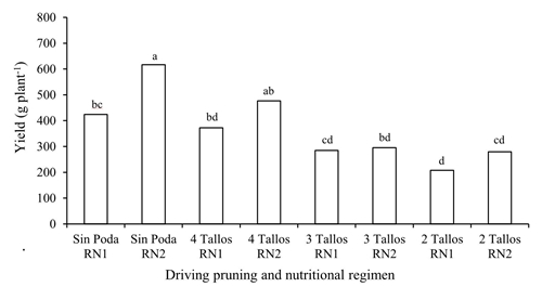 Figure 1 Yield of habanero chilli due to the effect of driving pruning and the nutritional regime. RN1= supply of the universal nutrient solution (Steiner, 1984) throughout the crop cycle. RN2= supply of specific nutrient solution for each phenological stage of habanero chilli (López-Gómez et al., 2017). Means with the same literal are statistically equal according to the Tukey test (p≤ 0.05).