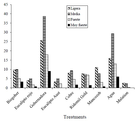 Regarding the severity (Figure 1), only the treatments of Malathion and Australian eucalyptus did not show fruits with very strong damages. In the control and in the governor’s statement there were more than 10 fruits with strong damages and more than 25 fruits with medium damages. Red eucalyptus, Australian eucalyptus and Malathion presented less than 5 fruits with light damage. In general, light damage prevailed in all treatments except for Mancozeb and Ridomil fungicides where light damage predominated or there was no trend.