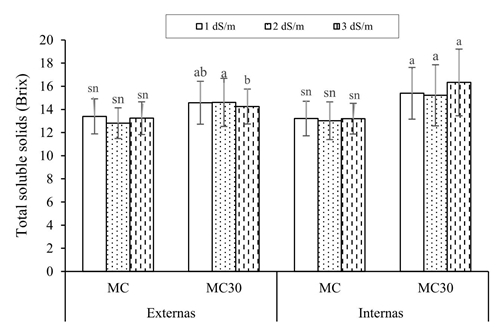 Figure 1 Total soluble solids (Brix) in cape gooseberry fruits by effect of electrical conductivity of the nutritive solution, position in the plant canopy (external and internal) and fruit maturity (MC= commercial maturity, MC30= 30 days after MC). Means with the same letter, indicate that the differences are not significant.