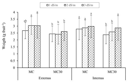 Figure 2 Weight of cape gooseberry fruits by effect of electrical conductivity of the nutrient solution, position in the plant canopy (external and internal) and fruit maturity (MC= commercial maturity, MC30= 30 days after MC). Means with the same letter, indicate that the differences are not significant.
