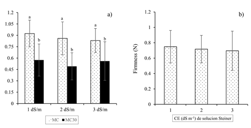 Figure 4 Effect of electrical conductivity (EC) on firmness of cape gooseberry by effect of the date of harvest of the fruit (a); and electrical conductivity of the nutrient solution (b). Means with the same letter, indicate that the differences are not significant.