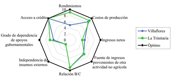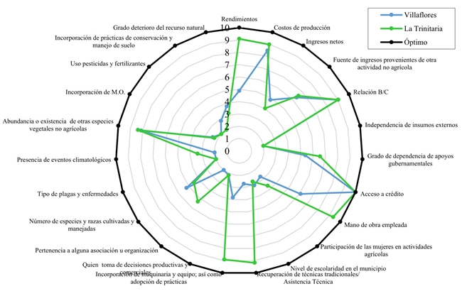 Derived from the measurement of the indicators that measure sustainability in the three areas of the corn production system for the municipalities of Villaflores and La Trinitaria, Chiapas, the radial graph is shown below that shows the general vision of the evaluation to determine the sustainability profile, obtained from the approach of the optimal values passes each indicator, considering its ideal state (Figure 4).