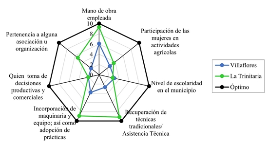 With regard to social indicators, values lower than 3.01 and 5.08 are reflected in the moderate average for the two municipalities. In the case of Villaflores, a vulnerable sustainable level is noted in the indicators of employed labor, recovery of traditional techniques and technical assistance, incorporation of machinery and equipment, as well as adoption of practices, and belonging of the producers to an association or organization.