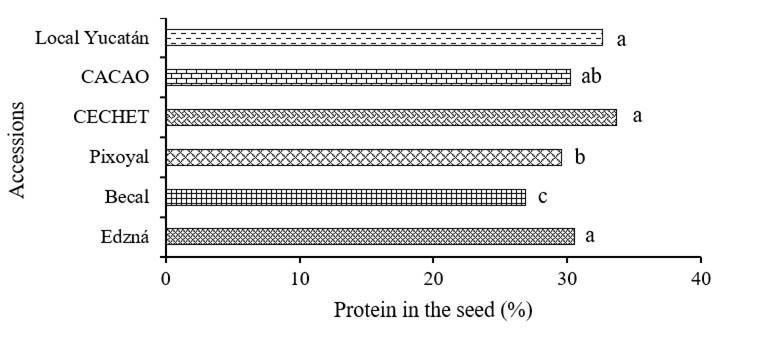 The protein content in the seeds of the chihua pumpkins accessions is statistically different (p≤ 0.05). The accession that showed the highest (p≤ 0.05) % PROTSEMC was CECHET with 33.6% compared to Becal, Pixoyal, CACAO, Edzna and Local Yucatan, which obtained in that order 26.9, 29.6, 30.3, 30.5 and 32.7% PROTSEMC, respectively (Figure 1).
