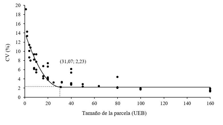 This model has a coefficient of determination of 76.96% and an F statistic that is also significant (p< 0.01) (Table 2). Plot size tends to be higher with the QRP method than with the LRP, due to the difference in fit. Peixoto et al. (2011) in trials with passion fruit attribute this tenure to the curvature of the model. Mendes et al. (2016) found a plot size for coffee of 10.53 UEB larger with the QRP method compared to the LRP method.
