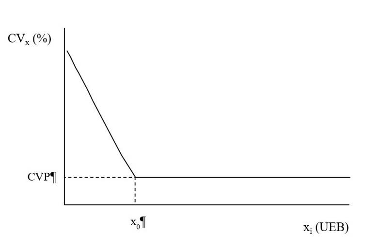 Among the methodological proposals for estimating the optimal size of the experimental plot, are the segmented regression models. Paranaiba et al. (2009) propose to fit a linear regression model with constant (LRP) for the relationship between the coefficient of variation (CV) of the yield and the plot size (measured in basic experimental units (UEB)), as seen in the Figure 1, where for the values xi ≤ x0 this relationship is described by a decreasing linear model to a certain point, after which it becomes constant. The CVP value that corresponds to the inflection point is obtained from an iterative process.