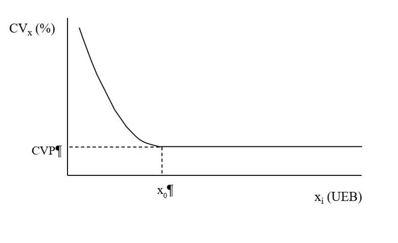 Where: CVx= is the coefficient of variation between the totals for plots with x i basic units; CVP= is the coefficient of variation at the point where the two segments meet; xis the parcel size measured in basic units; and ε i is the error associated with CVx, supposedly normal and independently distributed, with zero mean and constant variance.
