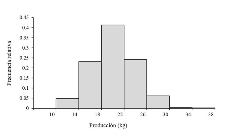 At the time of harvest and weighing of the test, of the 1 600 basic experimental units an average production of 19.9 kg was obtained per basic experimental unit, with a standard deviation of 3.8 kg. The values ranged between 9.5 kg and 38 kg. As observed in Figure 3, 41% of the basic experimental units weighed between 18 and 22 kg.