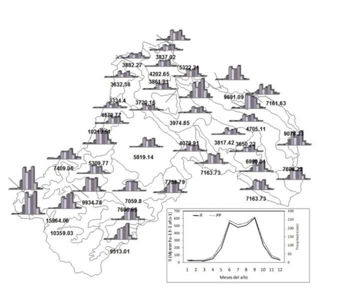 The erosivity index of annual rainfall ranges from 3 334 to 15 964 Mj mm ha-1 h-1 year-1. In Figure 3 the monthly and annual mean values of R are shown, starting in May when the erosive potential of the rain increases, reaching in this month values of 193 Mj mm ha-1 h-1, for September the erosive potential of 607 Mj mm ha-1 h-1.