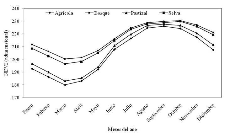 The information on the vegetation cover was obtained from the MODIS sensor, available on the website of the National Commission for the Knowledge and Use of Biodiversity (CONABIO). Maps were prepared at a monthly level of the normalized vegetation index (NDVI), from 2003 to 2007, thus having 36 point values of each type of cover (if the oak forest with primary vegetation is considered as an example, which had 676 point values at the monthly level, in the total of the cycle, 24 336 values were obtained, only for said coverage).