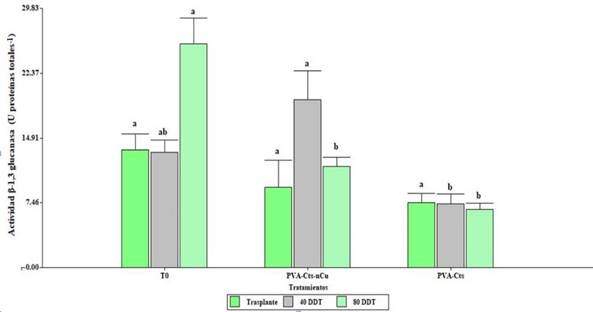 Figure 2 Enzymatic activity of β-1, 3 glucanase in tomato plants with the application of PVA-Cts-nCu and PVA-Cts. Means with the same letter are statistically equal Fisher’s LSD, p≤ 0.05.