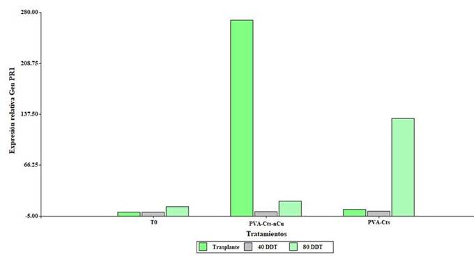 The results of the expression of the PR1 gene are shown in Figure 4. The PVA-Cts-nCu treatment overexpressed the PR1 gene (268.3, 0.72 and 8 times with respect to T0) at transplantation, 40 and 80 DDT. Like PVA-Cts-nCu, the PVA-Cts treatment overexpressed the PR1 gene (3.9, 1.5 and 123.2 times with respect to T0) at transplantation, 40 and 80 DDT. These results suggest that the PVA-Cts-nCu complex could play an important role in the activation of genes that encode the production of PR proteins, related to the salicylic acid signaling pathway and systemic acquired resistance (RSA) linked to stress tolerance (AbuQamar et al., 2009).