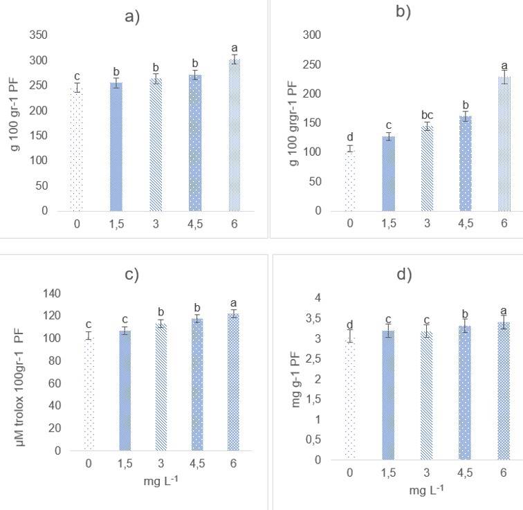 The biosynthesis of phenolic compounds, flavonoids and antioxidant capacity was positively influenced by the application of Se (Figure 2a-2c), obtaining the highest values with 6 mg L-1. Various studies have shown that the application of Se can increase the production of bioactive compounds (Motesharezadeh et al., 2020). Results like those of the present study were obtained in Capsicum annuum L., where the application of Se increased several bioactive compounds such as phenols, flavonoids and antioxidant capacity (Natividad-Torres et al., 2021).