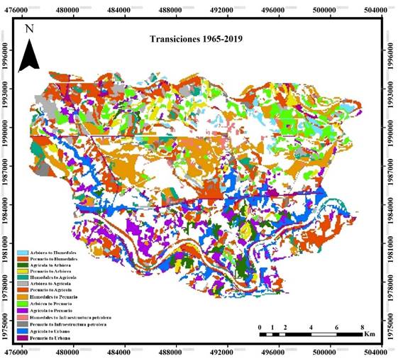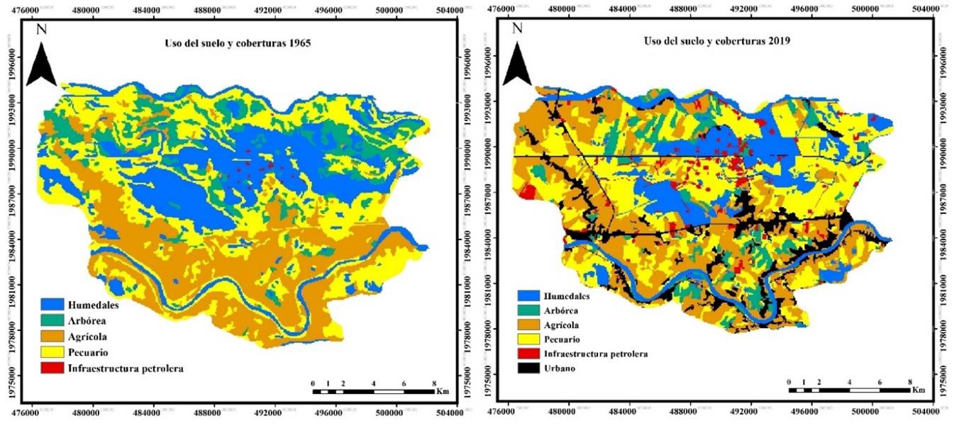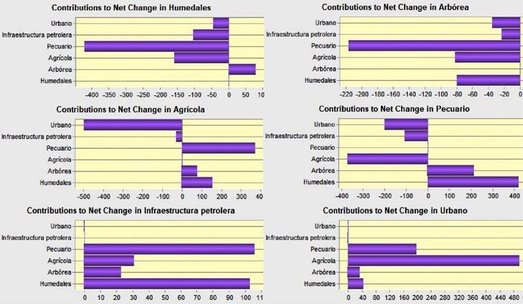 It is essential to note that to ensure that the crossing of the categories of land use and covers with the images in Land Change Modeler and the crossing of tables with CrossTab was equivalent, it was decided to unify the classification methodology with a reclassification with the Reclassify command of Arc GIS 10.5®, obtaining: 1) wetlands (rivers, lagoons and marshes); 2) arboreal (medium rainforest and riparian vegetation); 3) agricultural (crops); 4) livestock (grasslands with different levels of management and in association with shrublands and brambles subject to temporary flooding); and 5) oil infrastructure.