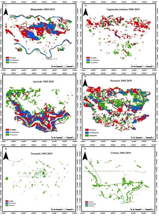 In 1965, 26.1% of the area of the SOF corresponded to wetlands, and 12% was represented by arboreal vegetation; the agricultural and livestock areas occupied the largest areas (28.3 and 32.7%, respectively), and the infrastructure for the extraction of oil barely represented 0.1% of the territory (Figure 2 and Table 2). In 2019, it was detected that wetland and arboreal vegetation covers occupied 18% and 7.3%, agricultural and livestock areas maintained the largest area (29.3 and 32.2%), oil infrastructure increased its area (3.4%) and urban use appeared (9.7%) (Figure 2 and Table 2). It should be noted that in the calculation of gains and losses (Table 2) and in the map of losses, persistence and gains for each of the categories (Figure 3).