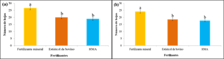 The results of the first cut showed that there were no statistically significant differences for any of the factors, nor for the triple and double interactions with respect to the number of leaves. This means that neither the soil factor nor the fertilizer factor influenced the leaf yield of the two cultivars during this cut. In the second cut, the fertilization factor generated statistically significant results on the number of leaves, being mineral fertilizer the one that generated the highest number of leaves (the average was 26.69), applying (Figure 2a), compared to the leaves generated by manure and AMF, which were 20.06 and 18.93, respectively.