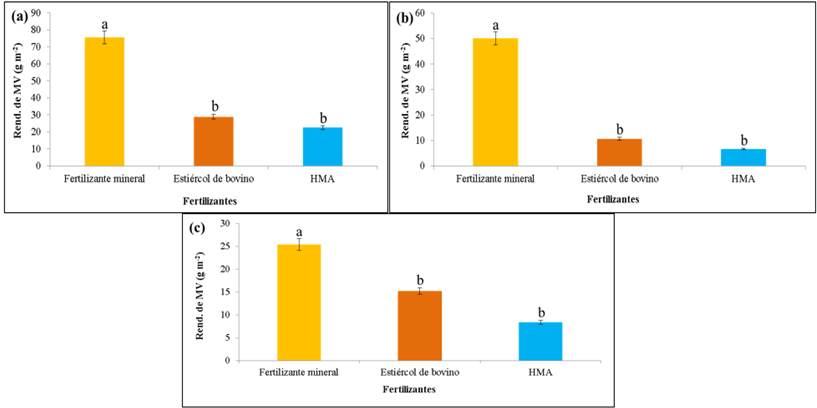 The results of the first cut showed that there were no statistically significant differences for triple and double interactions on GM yield. The fertilization factor generated statistically significant results on factors soil and cultivar. The results also indicated that the best yield of GM was obtained with the mineral fertilizer during the three cuts; reaching values of 75.62 g m-2 (756.2 kg ha-1) for the first cut (Figure 3a), 50.1 g m-2 (501 kg ha-1) for the second cut (Figure 3b) and 25.44 g m-2 (254.4 kg ha-1) for the third cut (Figure 3c), respectively, compared to treatments with bovine manure and the inoculant AMF (Glomus fasciculatum) that turned out to be the same in this study.