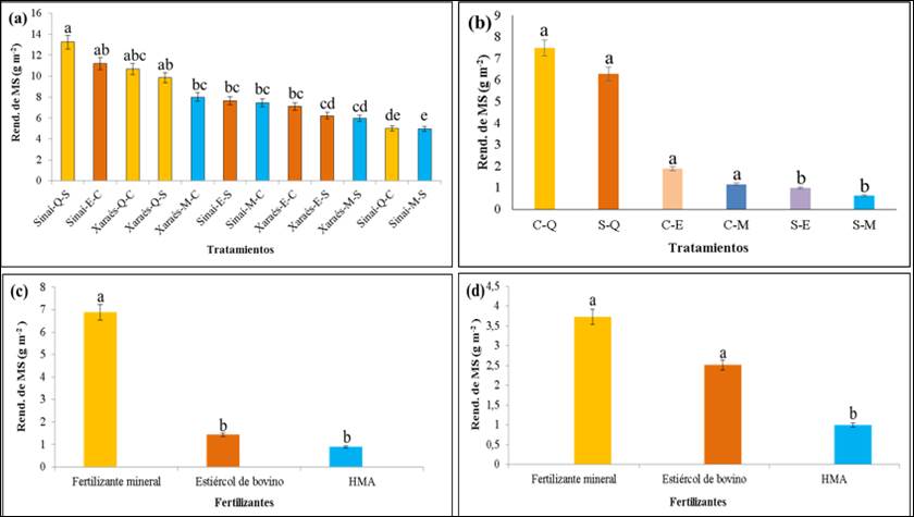 In the first cut, the triple factor cultivar*soil*fertilizer generated statistically significant results on DM. The best combination (Figure 4a) to obtain the highest yield of DM (13.5 g m-2 (132.5 kg ha-1)) was presented by ‘Sinaí’ with mineral fertilizer and unsterilized soil (Sinaí-Q-S). While the lowest yield (4.95 g m-2 (49.5 kg ha-1)) was obtained with the combination of the cultivar ‘Sinaí’ with the inoculant AMF and the unsterilized soil (Sinaí-M-S). Fertilization with manure + sterilized soil showed a significant effect on the DM yield (11.2 g m-2 (112 kg ha-1)) of the cultivar Sinaí.
