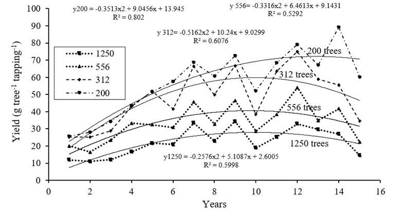 The yield of dry rubber in grams per tree per tapping (GT) evaluated for 16 years showed significant differences (p< 0.0001) between densities (Figure 1). The high planting densities induced strong competition between trees, which favored low yield per tree and low efficiency of labor (tappers), especially at the beginning of the exploitation of the plantations, results that coincide with what was reported by Ng et al. (1993); Verheye (2010). The lowest densities (D200 and D312) showed higher average yield, with 67.21 and 51.61 g per tree per tapping; respectively, which corresponds to an annual average of 6.72 and 5.16 kg per tree, respectively. The densities D1250 and D556 had lower yields of 23.63 and 35.82 g, respectively, equivalent to an annual average of 2.36 and 3.58 kg per tree, respectively. According to Dey and Datta (2013), the yield per tree per tapping is negatively influenced by the increase in population density, which coincides with the results obtained, Figure 1 shows the yields and equations of adjustment of the densities.