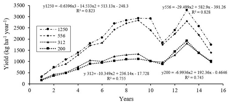 The accumulated yield of dry rubber per hectare (KH) during the period showed highly significant differences (p< 0.0001) between densities. The higher the density, the greater the number of trees in tapping and the higher the yield of dry rubber per unit area, which coincides with what was reported by Qi et al. (2016). The densities D1250 and D556 had accumulated yield of the entire period of 30.62 and 27.17 t of dry rubber, respectively, with significant differences between them (p< 0.0001), while densities D200 and D312 produced yields of 14.4 and 15.24 t of dry rubber, respectively (p< 0.0001). According to the results, the annual yield per hectare and the accumulated yield per hectare were higher at higher density, which is in accordance with what was reported by Dey and Datta (2013). Figure 2 shows the yields and equations of adjustment of the densities.