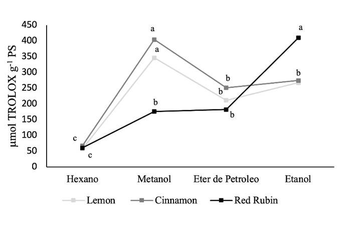 In the present study, free radical scavenging properties were shown, and the values obtained showed indicators of antioxidant capacities based on the elimination of the free radical used in the ABTS technique. It was observed that the values for the free radical scavenging activity are higher when the solvent used was methanol for the Lemon and Cinnamon varieties, it was not the same case for the Red Rubin variety since, in these extracts, the greatest efficiency of antioxidant activity occurred when the solvent used was ethanol (Figure 3).