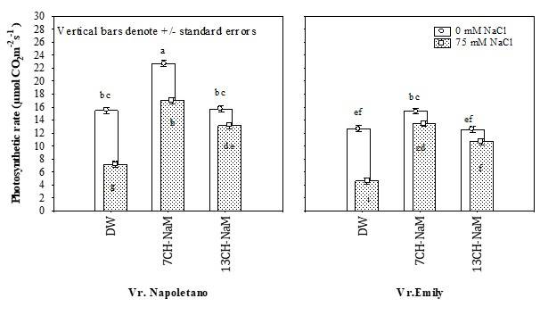 Figure 1 Effect of varieties × NaCl × NaM interaction in photosynthetic rate of two basil varieties cultivated in salinity stress conditions. Different letters show significant statistical (p= 0.05).