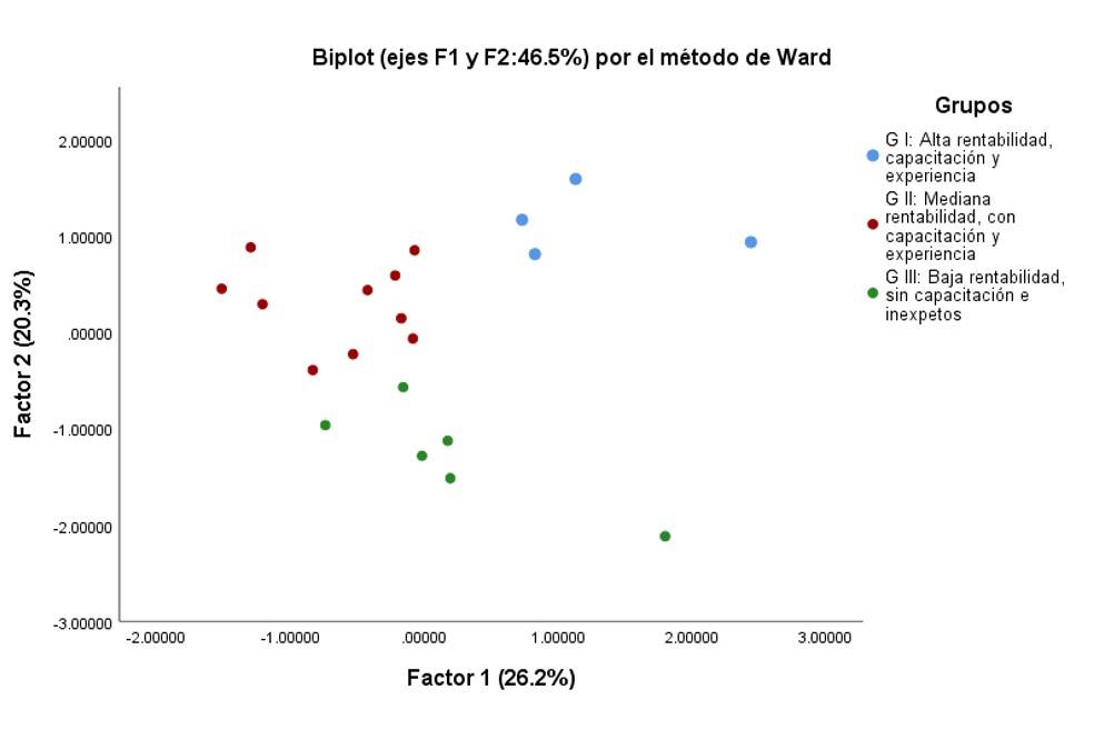 Analyzed in a factorial plane of axes 1 and 2. Group I (high profitability, training and experience): Juan Barrueta, Fedérico Barrueta, Victor Barrueta and Enrrique Barrueta. Group II (medium profitability, with training and experience): Gabriel Barrueta, Cenobio Barrueta, Marcelino Barrueta, Jiosé Baltazar, Ismael Barrueta, Florina Cruz, Eustasio Denova, Marcelino Martínez, María Domínguez and María Estrada. Finally, group III (low profitability, untrained and inexperienced): Gerardo Baltazar, Lortd Macedo, Marcos Baltazar, Gustavo Vences, Leonardo González and Diana González.