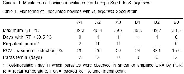 Los resultados obtenidos después de realizar tres pases a través de bovinos susceptibles mediante la inoculación de B. bigemina cepa BIS se presentan en el Cuadro 1. El bovino A1 presentó parasitemia, aunque con porcentaje de EI bajó (<0.01 %) en los días 2 y 3 post-inoculación (PI), la TR se incrementó ligeramente (39.3 °C), y el porcentaje de caída del VCA fue del 25 %, sin requerir tratamiento específico contra babesiosis bovina. El bovino A2 mostró parasitemia (< 0.001 %) durante los días 10 y 11 PI, con TR elevada (40.4 °C) el día 3 PI y descenso en el valor de VCA del 25 %.