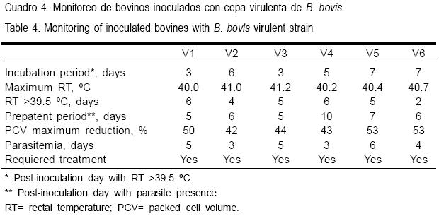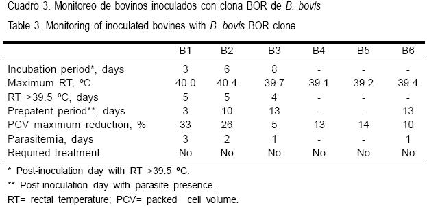 Los resultados obtenidos después de realizar tres pases a través de bovinos susceptibles mediante la inoculación por jeringa de la clona BOR de B. bovis se presentan en el Cuadro 3. Los novillos B1, B2 y B3 mostraron signos clínicos de moderados a ligeros a medida que el pase fue realizado: el período de incubación incrementó; el número de días con fiebre disminuyó; el período prepatente aumentó y la reducción en el VCA que decreció solamente 5 % en el tercer pase. No hubo presencia de signos clínicos en los novillos B4, B5 y B6 infestados con la progenie de las garrapatas R. microplus provenientes de los bovinos B1, B2 y B3, respectivamente. Por otra parte, no se logró encontrar parásitos por la lectura de laminillas teñidas con Giemsa durante el experimento en los animales receptores B4 y B5; sin embargo, se observaron EI en el bovino B6 (receptor de la progenie de garrapatas R. microplus alimentadas sobre el animal inoculado con el tercer pase), el cual apareció positivo el día 13 post-infestación. Los novillos no mostraron signos clínicos y la parasitemia fue demasiado baja para ser cuantificada. Este experimento demostró la falta de transmisión a través de garrapatas de la clona BOR después de uno y dos pases en ganado susceptible. La población fue transmitida después del tercer pase en animales intactos. Sin embargo, no existe riesgo aparente de que la enfermedad se presente, debido a que los parásitos no revirtieron a la virulencia por lo menos después de tres pases en bovinos. Ninguno de los animales de este grupo requirió ser tratado con medicamentos babesicidas. Todas las garrapatas colectadas de los animales inoculados con la clona BOR fueron negativas a la prueba de hemolinfa, incluyendo aquéllas que transmitieron el parásito a su progenie después del tercer pase.