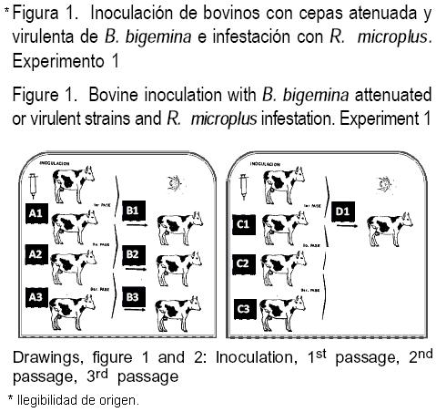 La cepa inmunizante de B. bigemina denominada BIS es originaria de México, fue obtenida de un caso clínico mediante aislamiento, adaptación y propagación continua en cultivo in vitro(9). Desde entonces, se ha mantenido alternadamente, ya sea en cultivo in vitro o en nitrógeno líquido como estabilizado criopreservado(16,21). Esta cepa ha sido evaluada como vacuna viva atenuada en estudios previos(10,11,12) y presentó un comportamiento semejante al descrito para cepas atenuadas. La cepa virulenta de B. bigemina (C) fue donada por el Dr. Lucious Chieves (USD-APH1S-NVSL, Ames, lowa, EE.UU.). Inicialmente fue aislada de un caso clínico y ha sido mantenida por pases a través de ganado susceptible, garrapatas y nitrógeno líquido(10,11). Se utilizó una colonia de garrapatas R. microplus libre de Babesia spp., mantenida in vitro y en animales en condiciones controladas(8).