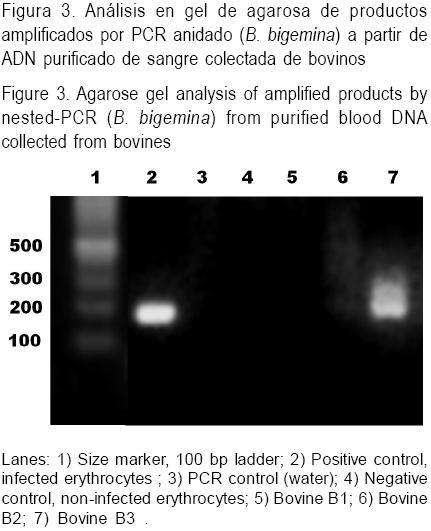 Sangre colectada del bovino B3 y procesada mediante la prueba de PCR-anidada confirmó la presencia de material genético de B. bigemina, al detectarse un fragmento del tamaño esperado de 172 pb especifico para B. bigemina (ver resultado representativo en Figura 3).