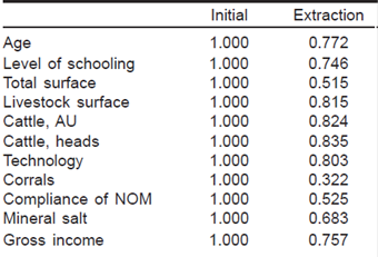 A total of 43 variables were studied and the data was organized, systematized and analyzed using various multivariate techniques. The detailed study of the original variables resulted in a selection of 11 variables that were considered most important economically and productively for their contribution to a better analysis of the technological and social components used in the PU. The selected were subjected to a factorial analysis or a dimensional reduction16, to be summarized and explained with information that contained the full set of observed variables; identifying as appropriate, a smaller number of unobserved variables, called factors. The first statistical tests helped to confirm the 11 original variables that were analyzed by principal component analysis (PCA), and then later by cluster analysis, this permitted identifying the different types of producers17. The variables studied were, age and level of education of producers, total hectares and cattle area, animal heads and units, income (other income such as complementary professional activities, like employment, etc. were not considered, but only those deriving from livestock rearing), participation in animal health campaigns, equipment, infrastructure and application of mineral salts.