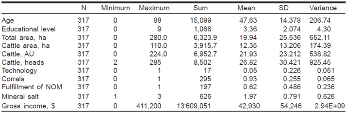 Se aplicaron 317 entrevistas a productores ganaderos seleccionados de manera aleatoria, considerando como marco muestral a 6,508 productores de bovinos registrados en el censo ganadero de la región14. Se utilizó un muestreo aleatorio simple y se consideró a cada unidad de producción (UP) como una unidad experimental representada por cada productor.