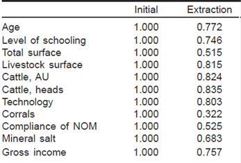 Se estudiaron 43 variables cuyos datos fueron organizados, sistematizados y analizados por medio de diversas técnicas multivariadas. El estudio minucioso de las variables originales derivó en una selección de 11 de aquéllas consideradas más importantes económica y productivamente por su contribución a un mejor análisis de los componentes tecnológicos y sociales utilizados en las UP. Las seleccionadas se sometieron primeramente a análisis factorial o de reducción de dimensiones16, para que se resumiera y explicara la información contenida en el conjunto de variables observadas; identificando según sea el caso, otro número menor de variables no observadas, denominadas factores. Las primeras pruebas estadísticas coadyuvaron a confirmar las 11 variables originales que fueron sometidas al análisis de componentes principales (ACP), y posteriormente al análisis de conglomerados, que permitió identificar los diferentes tipos de productores17. Las variables estudiadas fueron, edad y grado de estudios de los productores, hectáreas totales y superficie ganadera, cabezas y unidades animales, ingresos (no se contemplaron otro tipo de ingresos complementarios como las actividades profesionales, empleo, etc., sino sólo aquéllos que derivan de la actividad pecuaria), participación en campañas zoosanitarias, equipamiento, infraestructura y aplicación de sales minerales.