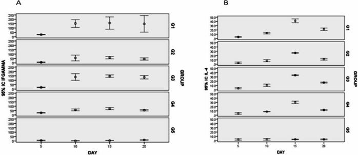 Figure 2 A) Levels of INF-g in immunized mice. B) Quantification of IL-4 cytokine by ELISA.