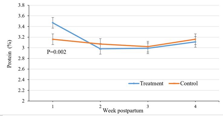 Figure 2: Milk protein percentage during first four weeks postpartum in treatment and control groups