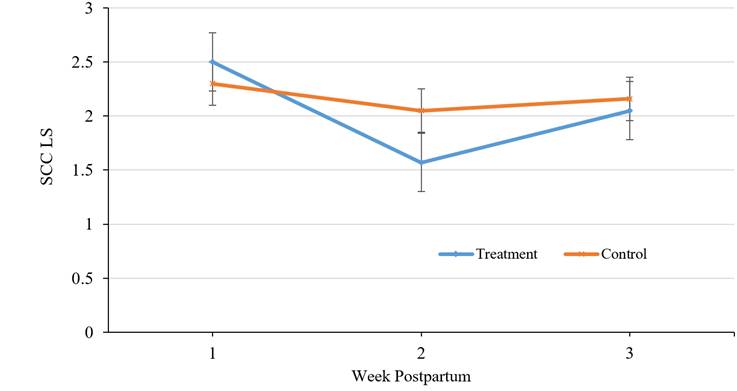 Figure 4: Somatic cell count linear score during first three weeks postpartum in treatment and control groups