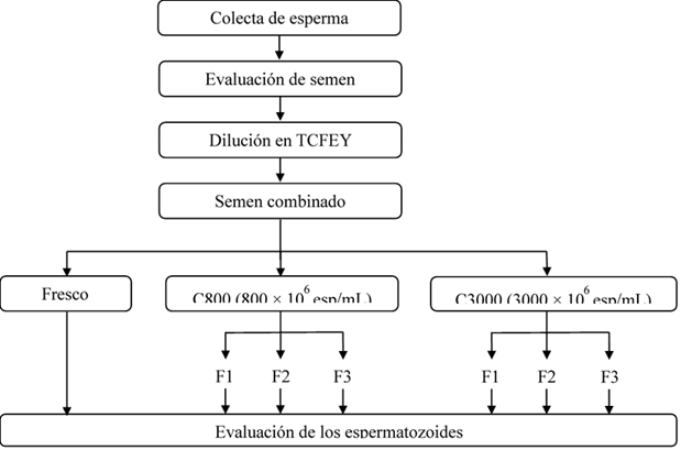 Después de su evaluación, los eyaculados de los cuatro carneros se diluyeron (1:2) con el diluyente TCFEY: Tris (33.19 g/L), fructosa (9.55 g/L), 10% de yema de huevo clarificada, ácido cítrico (17.29 g/L), penicilina G (4 g/L) y estreptomicina (3 g/L). Se combinaron en agua bidestilada, se tomaron dos alícuotas de semen y se colocaron en tubos cónicos para centrifugación (300 xg durante 20 min) (Figura 1). Después de eliminar el sobrenadante, se añadió TCFEY hasta alcanzar una concentración final de 800 x 106 espermatozoides/ml (C800) y 3000 x 106 espermatozoides/ml (C3000). La calidad de los espermatozoides se evaluó en cada concentración.