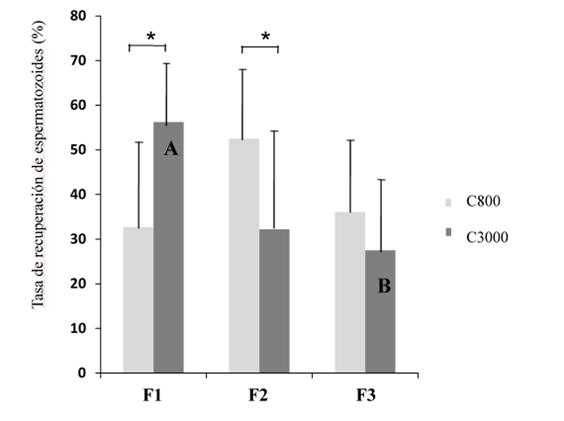 El porcentaje de recuperación de espermatozoides por SLC en la fracción que, en teoría, contendría los mejores espermatozoides (F3) no difirió (P>0.05) entre las concentraciones de C800 (36.1%) y C3000 (27.5%) (Figura 2). En la F1, el porcentaje de recuperación fue mayor en las muestras C3000 que en las C800; lo contrario ocurrió en la F2. En las muestras de C800, no hubo diferencias entre las tres fracciones, mientras en las de C3000 el porcentaje de recuperación en la F1 fue mayor que en la F3.