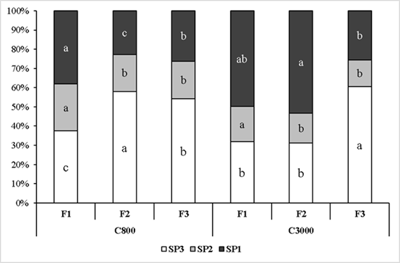 En las muestras de C800, la SP3 fue más alto (P≤0.05) en las F2 y F3 que, en la F1, mientras que las SP1 y SP2 fueron más altos (P≤0.05) en la F1 que en las demás fracciones (Figura 3). El patrón era diferente en las muestras de C3000. La SP2 (rápido y progresiva) fue más alta (P≤0.05) en la F1 que en las F3 (fracción selectiva) y F2. La alta concentración causó que la mayoría de los espermatozoides en la F3 (la que, en teoría, contiene los mejores espermas) provenían de la SP3 (rápido y no progresivo).