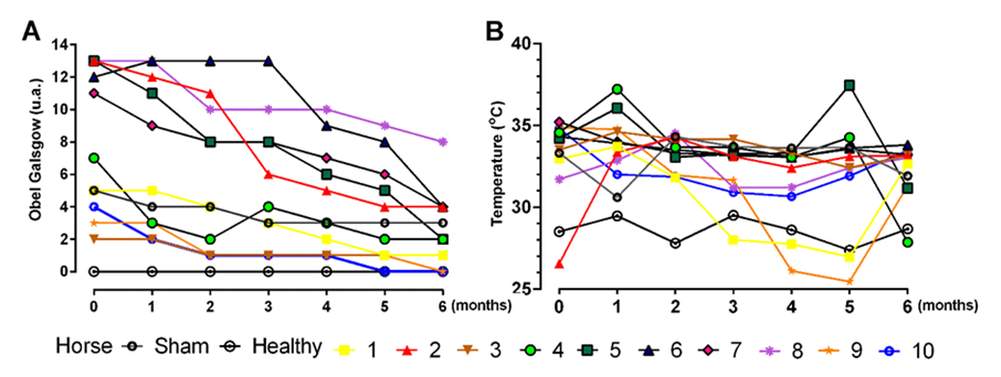 Evolución clínica (A) y la temperatura de los cascos (B) de los caballos tratados con CMM-AMO, el caballo sano y el caballo de simulación, según lo monitoreado por la escala de Obel-Glasgow y la termografía infrarroja.