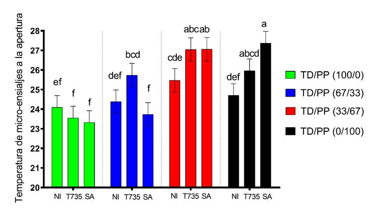| TD/PP: 67/33 | T-735 | 87.9±0.3de | 12.7±0.4d | 40.8±0.7d | 28.3±0.7cd | 68.3±0.6ab | 13.2±0.2cde |