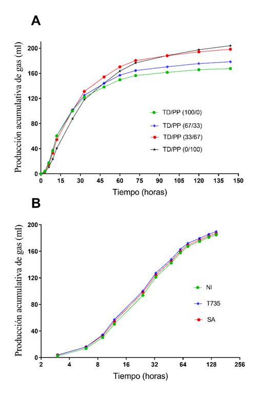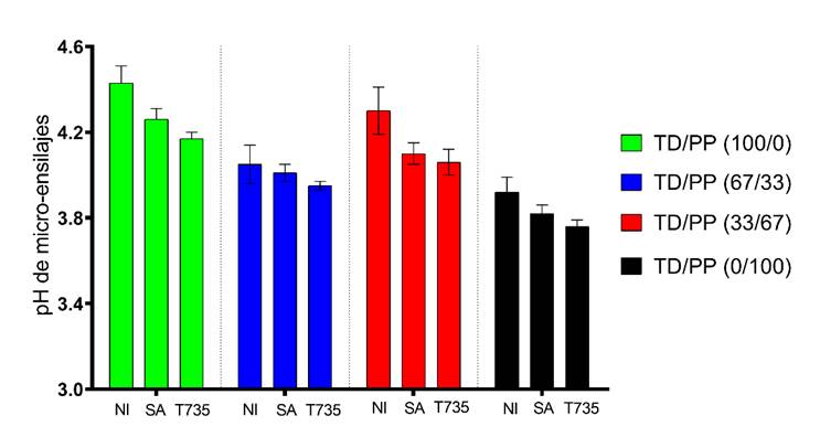 TD/PP= proporciones de Tithonia diversifolia/Pennisetum purpureum [Base de materia fresca (MF)]. NI= sin inóculo; SA= Sil-all es una mezcla comercial de inóculos de bacterias ácido-lácticas. T-735= es una cepa de bacterias ácido-lácticas epífitas.