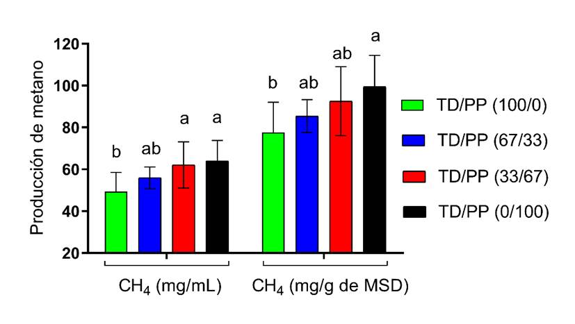 Se realizaron análisis de la producción neta de CH4 a partir del gas generado a las 72 h de incubación de 1 g de ensilado (Figura 3). La degradación de la MS osciló entre el 63.7 % y el 64.4 %. Cabe señalar que a las 60 h después del inicio de la incubación y cerca del punto de inflexión (HPI), se obtuvo aproximadamente del 80 al 88 % del gas total producido durante el experimento. Se produjo una menor cantidad de metano en los ensilados preparados exclusivamente de TD (TD/PP: 100/0) en relación con los ensilados preparados con alta proporción de pasto y los ensilados preparados exclusivamente de pasto (67 y 100 de inclusión de PP), pero no fue significativamente diferente de los ensilados preparados con bajas proporciones de pasto (TD/PP: 67/33). Se observó una mayor liberación de metano a medida que aumentaba la proporción de PP en la mezcla, mientras que la producción de metano más baja se encontró en los ensilados que contenían la mayor proporción de TD (100/0 de TD/PP).