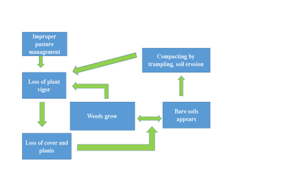 Pasture degradation due to improper management begins with loss of plant vigor, manifested in narrower leaves, low greenness index values and declines in regrowth capacity (Figure 1). Forage species experience a consequent loss in aerial cover, allowing weed growth or leaving bare soil, which favors compaction by animal trampling and erosion26,27.