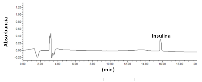 Figura 4 Cromatograma con picos de absorbancia de insulina a los 16 min en cada muestra donde se detectó insulina