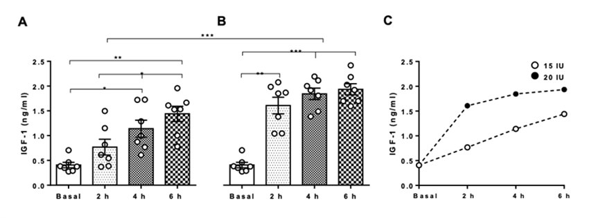 Figura 6 Concentración de IGF-1 en líquido sinovial de caballos tratados intraarticularmente con A) 15 UI y B) 20 UI de concentración de IGF-1 en el líquido sinovial de caballos tratados intraarticularmente. C) Correlación positiva de los 2 diferentes grupos, entre la concentración de IGF-1 y el tiempo de muestreo del líquido sinovial