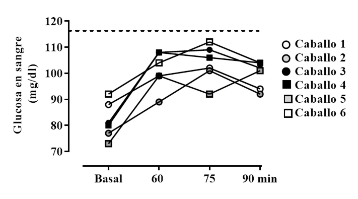 Figura 1 Resultados de la prueba oral de azúcar que muestran la concentración de glucemia para los 6 caballos